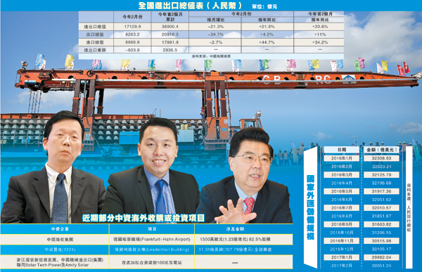 國家外匯儲備連跌7個月,至2017年1月底減至29982.04億美元,為2011年2月以來最低。另一方面,中國海關總署數據顯示,2016年全年內地貨物貿易進出口總值24.33萬億元(人民幣,下同),貿易順差3.35萬億元。國家商務部統計顯示,2016年全年,內地吸收外商直接投資8132.2億元,中國境內投資者對164個國家和地區的7961家境外企業進行非金融類直接投資,累計對外投資11299.2億元。