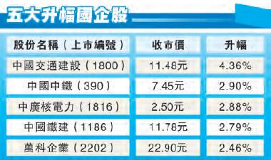 今日公布業績的騰訊控股(700)再度破頂,惟受制230元關口,收市升0.2%報228.8元;資金輪動炒作,地產股回勇及多隻基建鐵路股沖高,信和置業(083)升2.6%報13.94元,為升幅最大藍籌,恒隆地產(101)升1.2%報20.75元,長實地產(1113)亦升1%報53.55元;中國中鐵(390)升2.9%報7.45元,中國鐵建(1186)升2.7%報11.78元。