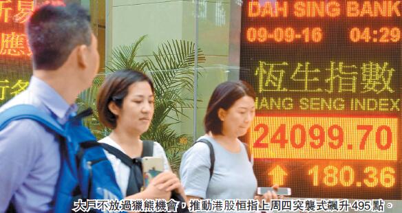 其後周三晚聯儲局一如預期加息四分一厘,並維持今年共加息三次的預測,消除加息步伐加快的疑慮。大戶不放過獵熊機會,推動港股恒指上周四突襲式飆升495點,並重奪廿天線,上周五已收報24309.93點,終再刷19個月新高。恒指上周累升740點(3.15%)。縱然A股沒振奮行情,國指上周仍勁升444點(4.41%),收報10513.52點。破關上揚的市勢中,上周港股主板日均成交為910.19億元,較前周大增36%,其中周四港股主板成交有1022億港元,周五成交更有1212.57億港元,充分顯示資金牛市的特色。國期未平倉合約亦從上周初的約31萬張,再升回約34萬張,破關後大戶重新下注。
