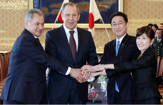 從左到右依次為俄防長紹伊古、俄外長拉夫羅夫、日外長岸田文雄、日防長稻田朋美