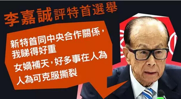 李嘉誠:斬釘截鐵說,今天是極需要中央和香港新的特首,溝通合作無間,才能帶領香港在短時間,有新的局面。今天香港有很多重要的問題,比如房屋、居住的問題,很多事情。如果特首能和中央有很好的合作和溝通,而中央又信任的話,很多時會有奇蹟的。我明年90歲了,1940年我就來了香港,這種感情是很深厚的,我也不想看到香港變得好似樣樣事情都是麻煩,很多麻煩如果要認真去做,中央的溝通信任特別好的時候,我們是可以減少了很多無謂的紛爭。如果你能夠解決細小單位的問題,很多年輕人就不用擔心自己住的問題。香港現在的GDP佔全國最多2%,如果可以好好發揮我們的力量,發揮我們以前有的好處(長處),未來還有很多好的條件。香港可以令不止自己國家看重,也可以被世界看重。