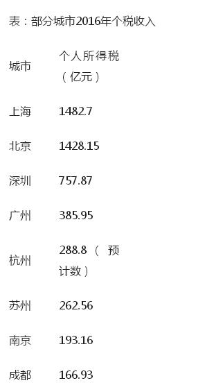 分城市來看,2016年,上海以1482.7億元的個稅收入位居榜首,北京以1428.15億元緊隨其后。京滬也是我國目前僅有的兩座個稅收入超過千億元大關的城市。