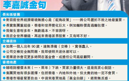 【香港商報網訊】記者曾浩榮報道:長和系旗艦上市公司長和(001)及長實(1113)昨日齊齊放榜,不過,集團主席李嘉誠在業績會上的言論,更受市場所關注。李嘉誠除多次提及「長和交棒給長子」是絕無問題外,更直言如果對目前世界經濟環境無擔心只是「鴕鳥政策」,強調要將公司置於「不敗之地」。