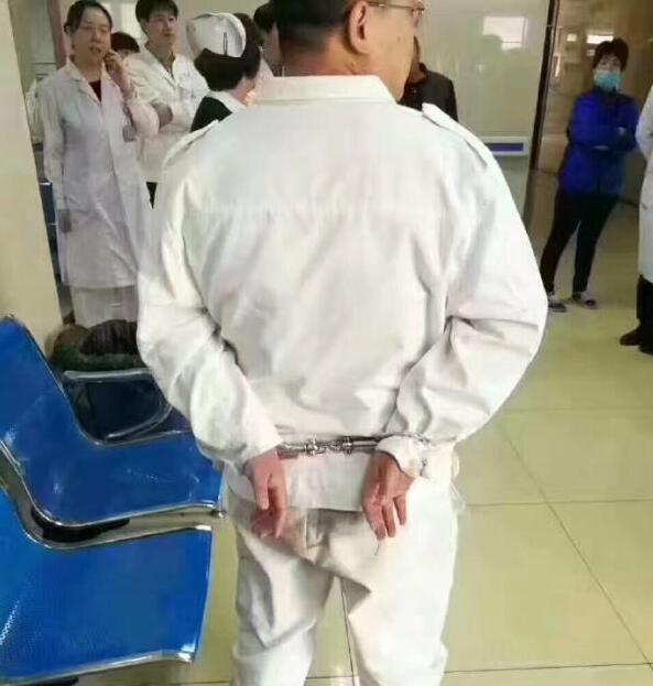 這名網友還附上了四張其所稱的“現場照片”,其中兩張照片中,一名身穿白色醫務人員工作服的男子雙手被手銬拷在身后。