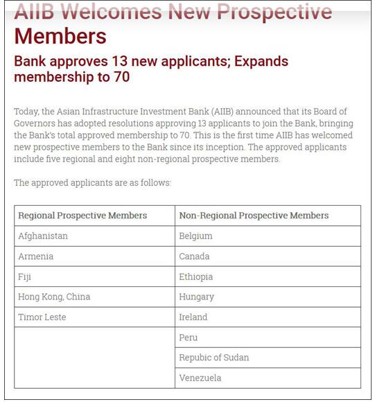 根據亞投行官方網站的公告,新成員分別為中國香港、加拿大、阿富汗、亞美尼亞、斐濟、東帝汶、比利時、埃塞俄比亞、匈牙利、愛爾蘭、秘魯、蘇丹和委內瑞拉。