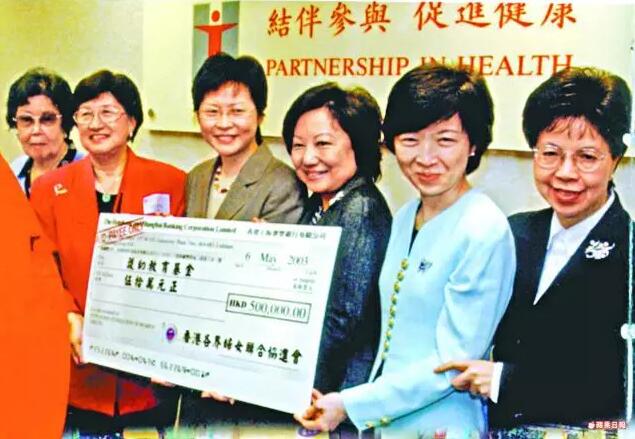 婦協代表林貝聿嘉(左)將一張50萬支票送交(右起)陳馮富珍、羅范椒芬、李麗娟和林鄭月娥。