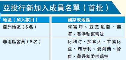 據內地媒體報道,繼亞投行2016年成立以后,總部位於北京的亞投行,這是首度接收一批新的會員,其中亞洲地區會員5名,包括阿富汗、亞美尼亞、斐濟、香港和東帝汶;非地區會員共8名,包括比利時、加拿大、衣索比亞、匈牙利、愛爾蘭、秘魯、蘇丹和委內瑞拉。當內部程式和首筆資本完成及到位后,便將成為正式成員。