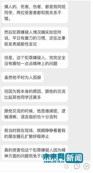 另外,有自稱是幾名當事人同學的網友反映,陳某確實在出事前發表過威脅性言論。但他同時也表示,陳某雖然平時為人孤僻,卻沒有精神問題。