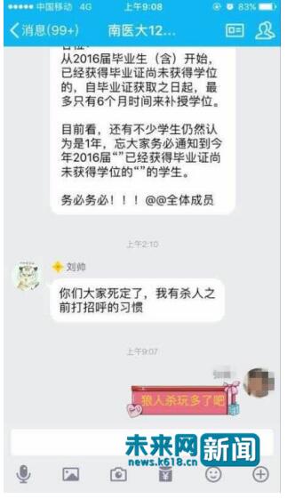 該寢室長還提到,殺人者劉某星期一和輔導員談話之后曾在qq上發出了“你們大家死定了,我有殺人之前打招呼的習慣。”的消息。