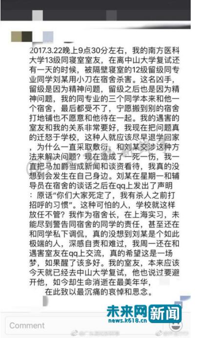 公告中稱,“3月22日晚21時20分左右,我校高層學生公寓發生一起惡性傷害事件。2013級學生劉某持刀行兇,兩名同學在阻止過程中受到傷害,一死一傷。傷者目前正在搶救。劉某當即被控制。警方已介入調查,案件正在偵破中。學校對于此事的發生十分痛心,正組織醫療專家全力搶救傷者,對相關學生進行心理疏導等,并積極配合有關部門處理相關事宜。”
