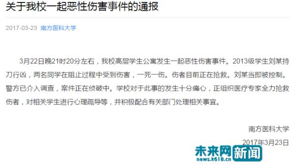 據南方醫科大學3月23日中午在其官方微信平臺發布的公告,22日晚9時許,該校某學生公寓發生一起持刀殺人事件,造成兩名在校的大四學生一死一重傷。