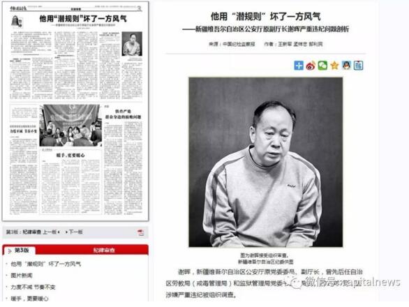 這名貪官,名叫謝暉,曾任新疆維吾爾自治區公安廳原黨委委員、副廳長。2015年7月,因涉嫌嚴重違紀被組織調查,2016年被“雙開”。