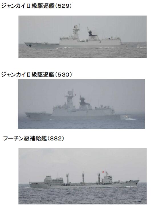 據統合幕僚監部的公告,日本海上自衛隊執行監視的船只是朝霧號。三艘中國海軍軍艦分別是529艦舟山號、530艦徐州號和882艦鄱陽湖號,均隸屬于東海艦隊。