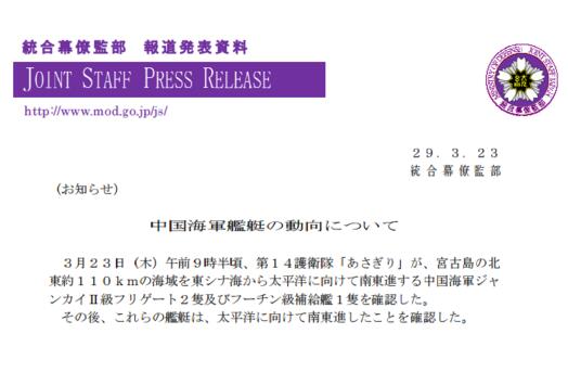 宮古海峽屬于國際海域,中國海空軍艦機穿越宮古海峽的行動目前已呈常態化趨勢,進入2017年之后,中國海空軍就已多次穿越宮古海峽前出第一島鏈。3月2日,中國海軍就組織了最大規模的穿越宮古海峽的行動,總計13架軍機和3艘驅護艦參與行動。