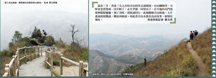 霧春三月,香港三尖之首的青山經常雲霧繚繞。在山腳仰望,尖峰會忽然變成一頂平帽子;走至半腰,回望山下,在平地的屯門建築物朦朦朧朧;到了頂峰,則與霧同行,此刻俯瞰青山腹地,大片迷霧緩緩飄過,驟添神秘感。因此看青山未能有高清效果,卻別有風味!