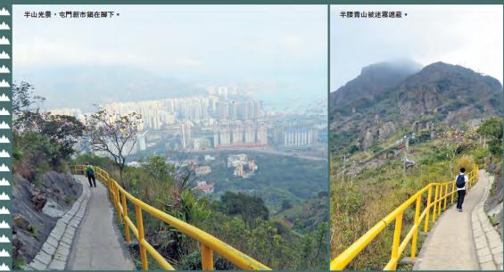 離開青山寺就進入中段路程,沿黃色扶手鐵欄泥石小徑直上半山的微波發射站。這段路會經過輸電塔,由於地勢愈來愈高,屯門新市鎮及青山灣不久在腳下隨行。途中經過兩個涼亭,第一個由政府建造,第二個由善信出資興建。後段登頂路,為全程最難辛,山路陡峭,石級跨度大,部分山徑沒有扶手,一些則有鐵鏈、尼龍繩作崖邊扶手。