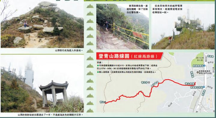 在屯門平地如屯門河一帶看青山,磅礡氣勢襲來,這一座尖、斜、高的山峰如何攀得上?翻查資料,青山山頂外形如堡壘,故英文名字為Castle Peak(堡壘山),其峰頂一帶地勢險要,因此又與釣魚翁山和蚺蛇尖合稱「香港三尖」,以高度計算,高海拔583米的青山為三尖之首。在天氣良好的日子遠望青山,半腰間的輸電塔、峰頂的發射站清晰可見。