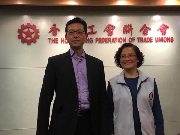 手持超过60张选委票的工联会呼吁选委投票支持林郑月娥。图为工联会会长林淑仪(右)、理事长吴秋北。