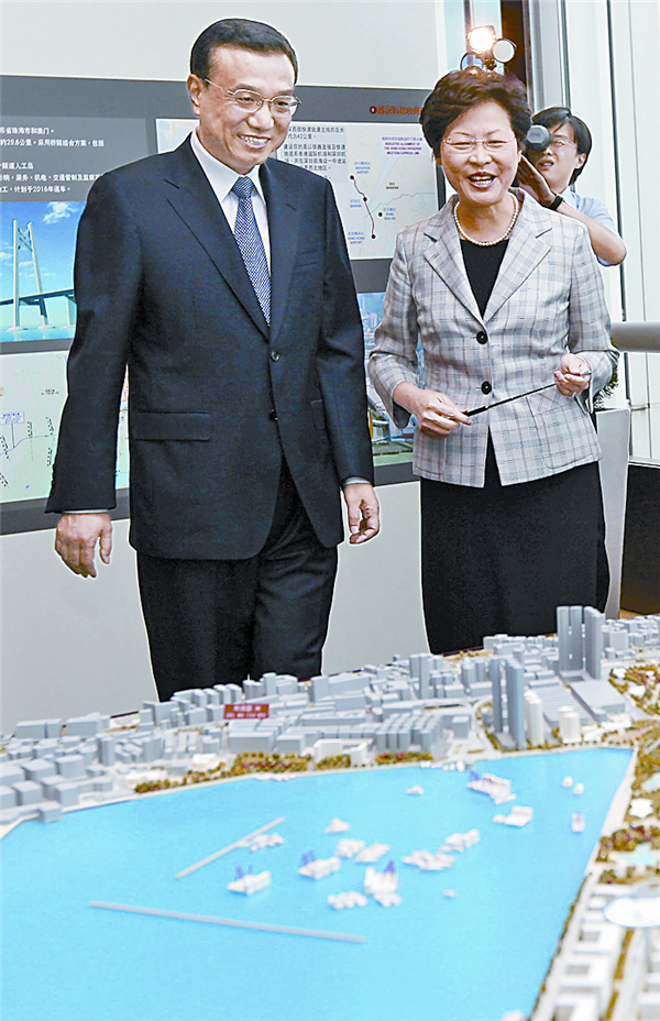 2011年,林鄭月娥向訪港的李克強介紹香港基建。