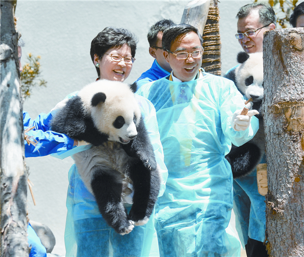 林鄭月娥去年訪臥龍擁抱大熊貓BB。