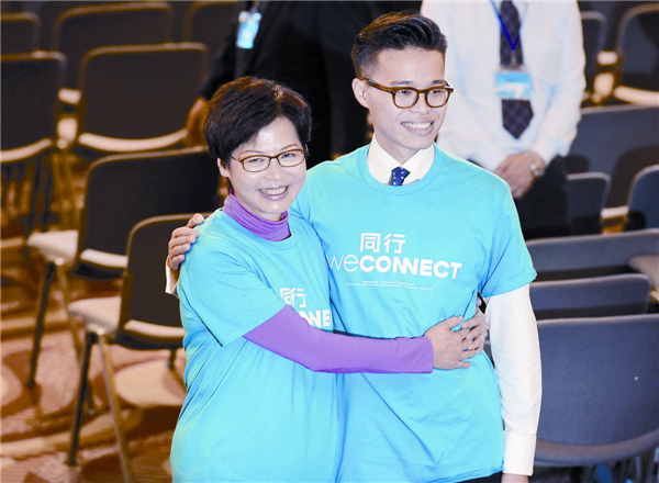 競選分享大會上,林鄭月娥擁抱長子林節思。