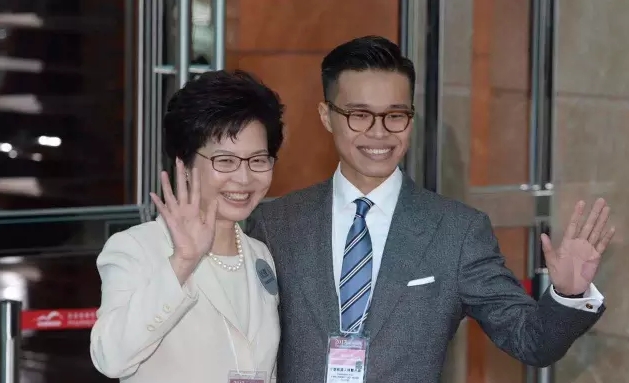 林鄭月娥與長子林節思今日(26日)在會展中心向選委問好(大公報記者林良堅攝)