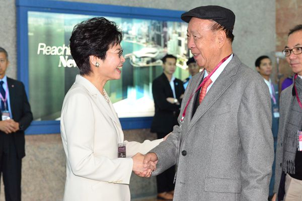 李兆基(中)和兒子李家傑與林鄭打招呼。