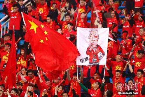 上周,國足在主場戰勝韓國隊,現場觀眾擎起中國隊主教練里皮的漫畫像。 中新社記者 富田 攝