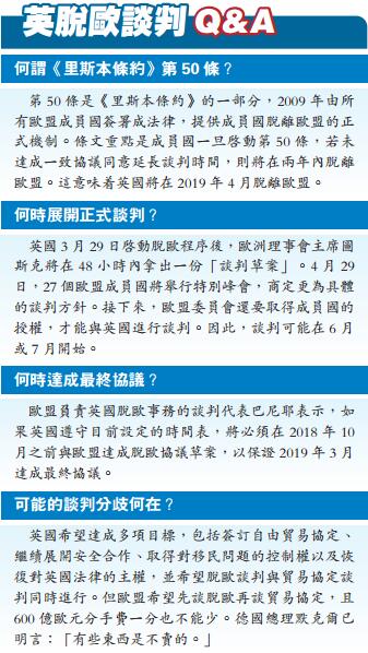 【香港商報網訊】英國首相文翠珊今日會致信歐洲理事會主席圖斯克,以啟動《裏斯本條約》第50條,這預示至少將持續兩年的脫歐談判正式展開,在此期間,英國希望與歐盟協商簽訂一項全面的新自由貿易協定。然而,英國政府也越發關注歐盟是否將對其實行懲罰或制裁。有英國高級官員表示,文翠珊並未竭盡全力,以爭取得到歐盟領導人的支持,並警告她若未能平息來自歐洲國家的敵意,可能將成為開啟談判進程的最大「攔路虎」。