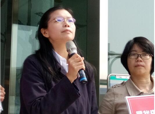 28日下午,李明哲妻子李凈瑜手持“尋找李明哲”牌子在海基會門口“陳情”。李凈瑜稱,27日深夜接到臺當局政府方面的間接消息,證實李明哲被大陸國安單位拘留。