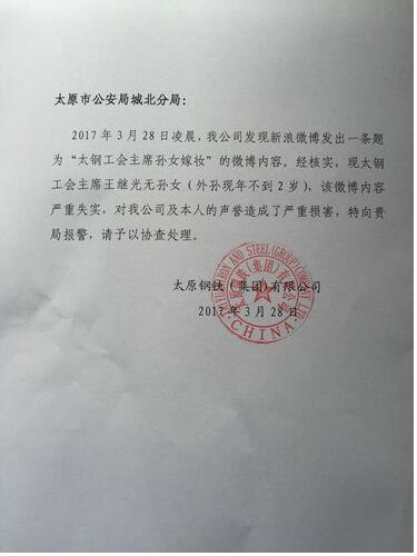 28日,太原鋼鐵集團正式向太原市公安局城北分局警方報案。太鋼方面表示,經核實,現太鋼工會主席王繼光無孫女(外孫現年不到2歲),該微博內容嚴重失實,對公司及本人的聲譽造成了嚴重損害,請予以協查處理。