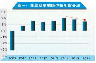 不是說美國經濟不行,只是未如想像般好。聯儲局加息與否基於兩大原則,一是通脹,二是就業。前者方面,對未來通脹的看法與油價關系早有談及,不贅。至於就業,筆者對美國就業市場的看法一向不太樂觀,原因是不同分析指美國就業增長已逐漸放緩。先看看圖一的2009年金融海嘯后至今非農就業總職位的每年增長率,見到去年全年職位增約1.5%,高嗎?2014年曾高見2.0%,而2010年的0.8%及2012年的1.4%就比它低,故現時這增長只屬中等水平。如果以整個趨勢來講,非農總職位的每年增長自金融海嘯后一直走上,但自2014年就開始下滑。如是者,美國就業很好嗎?在職位增長率顯然正在下跌下,就很難用「很好」兩字來形容。