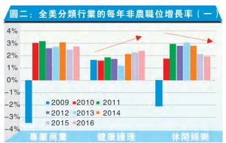 當然,近年美國非農新增職位表現不錯是有其原因的。看看圖二,圖中顯示了全美三大行業(以就業人數計算)的總職位每年增長率。這三行業的就業人數占全美逾四成,圖二見到近年排第一的專業商業及第二的健康護理總職位每年增長率表現都不錯,后者更每年遞升,要說這些行業支持了全美就業市場的增長也不為過。