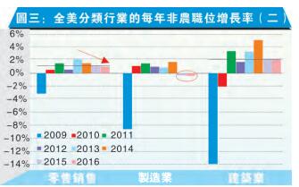 情况也不限於休镕娛樂業。圖三見到全美第四大行業(以就業人口計算)零售業也有相同情况,即其增長率已於2013年見頂回落。更甚的是,第五大行業的制造業已經連續兩年收縮,再數到第六大建築業的表現都只是中規中矩。如斯情况下,美國就業情况很好?一半半吧。除了圖二及圖三的六大行業外,其他行業如批發、資訊科技及采礦業也出現類似情况,唯一如圖二的專業商業及健康護理表現般理想的就只有金融類。