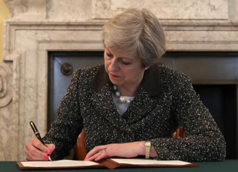英國首相文翠珊在唐寧街10號的辦公室,正式簽署了觸動《裏斯本條約》第50條、啟動脫歐程序的信函。路透社