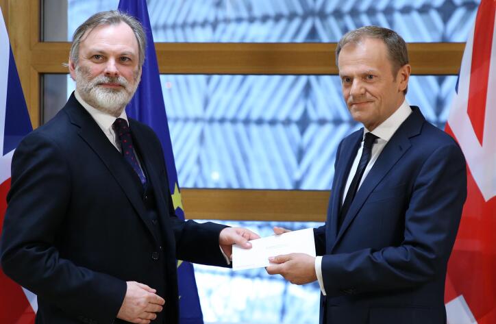 英國駐歐大使巴羅(左)將脫歐函交歐洲理事會主席圖斯克。新華社