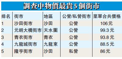 結果顯示,「香港家庭住家飯菜單」於各街市平均價格為81.3元,於7個私營街市平均價格為71.9元,但於7個公營街市的平均價格竟達90.6元,比私營街市貴二成六,而物價最貴及物價最平的街市差距高達1倍,最貴的為公營街市沙田街市,菜單合共價格為106元,比同區的私營街市隆亨街市的合共價錢86元,價格貴近二成半;最便宜的為由領展管理的屯門蝴蝶街市,菜單合共價格僅為54.5元,比各街市平均價格平逾三成。