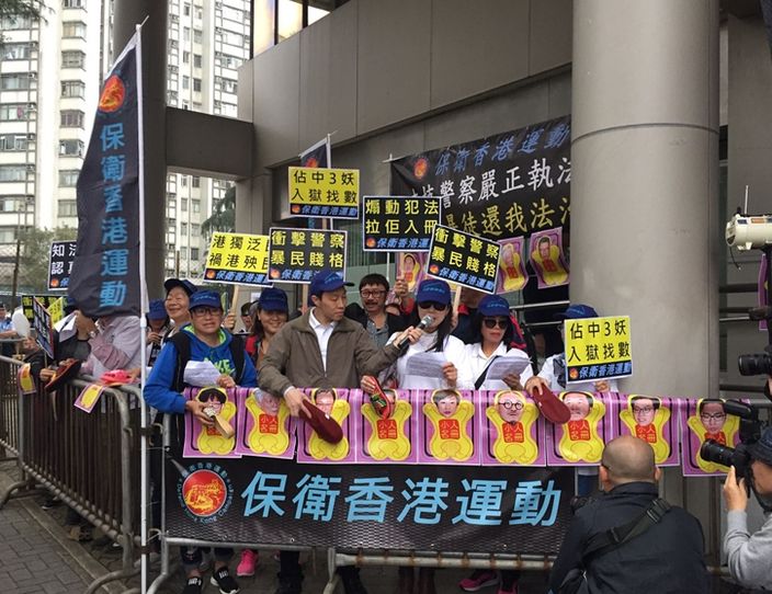 九人被控涉嫌串謀公眾妨擾、煽惑他人公眾妨擾,及煽惑他人煽惑公眾妨擾等罪,案件在東區法院提堂,今早法院外架起重重鐵馬,約五十名「保衛香港運動」示威者早上八時前已聚集於示威區,手持橫額並高叫「煽動犯法、拉佢入冊」等口號。