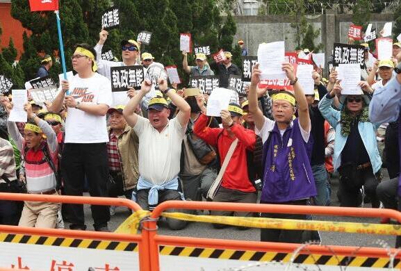 中國臺灣網3月30日訊 據臺灣《聯合報》報道,為抗議“年金改革”,臺灣警消聯盟29日展開“遍地開花”陳抗行動。昨天上午到大直“忠烈祠”春祭現場,下午兵分六路,前往蔡英文官邸、“行政院”、“監察院”、“立法院”、“考試院”和“內政部”抗議,部分現場并發生推擠沖突。數百名退休警消先在“忠烈祠”外聚集,蔡英文車隊抵達后,眾人下跪大喊“蔡小姐”,高舉“執政無能”、“全民遭殃”標語,隨后吶喊“蔡英文下臺”。蔡離去時,眾人再喊口號,并撕毀陳情書。