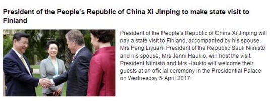 【觀察者網 綜合報道】芬蘭總統府、芬蘭駐華大使館網站3月29日發布:中華人民共和國主席習近平下周將對芬蘭進行國事訪問,國家主席夫人彭麗媛將陪同。芬蘭共和國總統薩利·尼尼斯特及夫人將于4月5日(星期三)在總統府舉行正式歡迎儀式。
