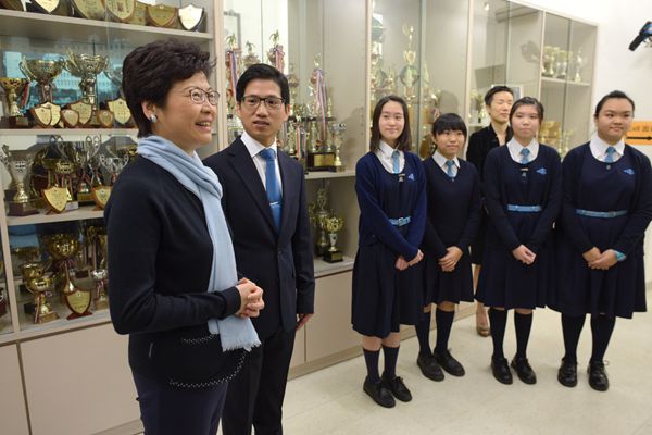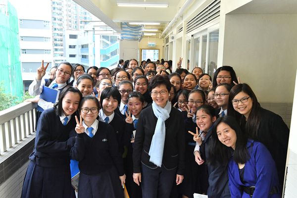 林鄭月娥昨日早上約10時抵達位於灣仔堅尼地道9至13號的母校,獲校長羅勤忠及學生在門外迎接。她其後在校長及修女陪同下,與約10名校友作短暫交流,然後到4樓參觀她有份捐錢興建的花園,最後再與約40名學生進行分享。