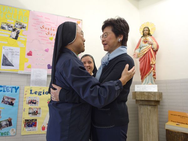 林鄭與一名修女熱烈擁抱。