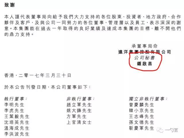 董小姐發現,以往年報和2016年中報,都有董事局主席兼行政總裁李明的署名落款,這一次年報,李明沒有署名落款,也未在年報前言的主席報告中落款。2016年報落款人變成了遠洋董事會秘書鐘啓昌。