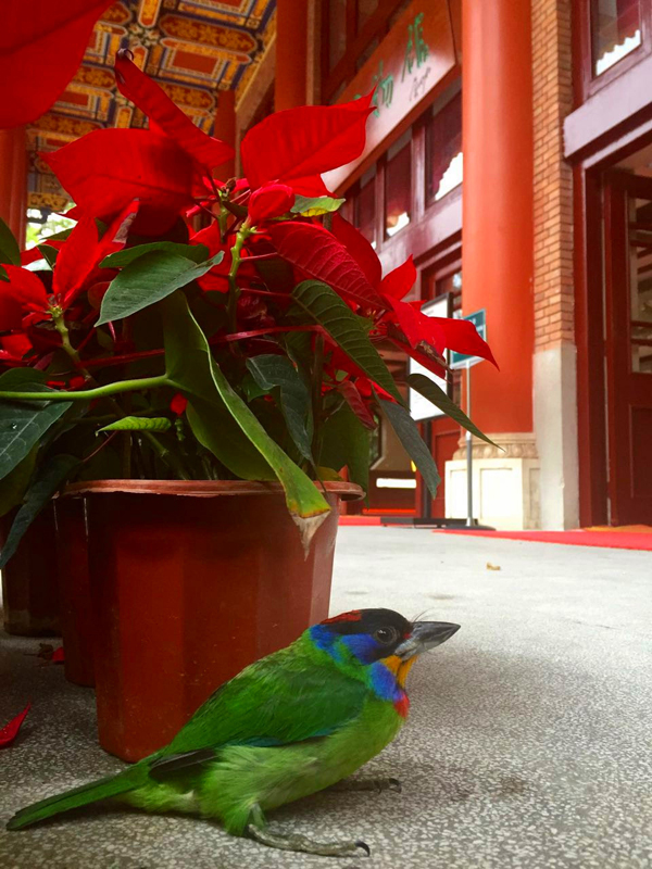 【香港商報網訊】3月30日,一只五彩飛禽落在羅浮山葛洪博物館大門口,工作人員見狀,將其移至花盆處休息。十幾分鍾後,五色鳥養足精神後便展翅飛回大自然中。據工作人員確認,此鳥名叫五色雀,現今極為少見,僅在中國大陸和台灣存活少數,已被列入《世界自然保護聯盟瀕危物種紅色名錄》。