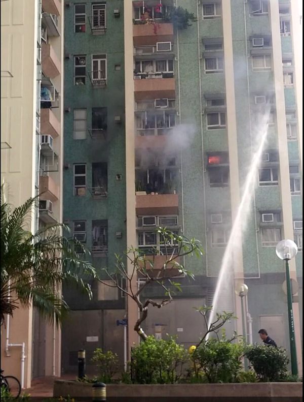 昨晨7時10分,單位突然冒出濃煙及火光,大量黑煙由窗口直卷出走廊及窗外,迅速籠罩樓上多個單位;火警單位外的大廈走廊亦充斥濃煙,令不少住客無法開門逃生。有大廈住客更目睹起火單位內有一名女子在窗口大叫救命。