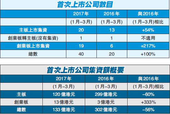 今年首季IPO的集資總額為133億元,按年下降56%。其中,於主板上市公司的IPO集資總額為120億元,按年下降60%。相反,創業板上市公司的IPO集資總額為13億元,較去年同期勁升3.33倍。