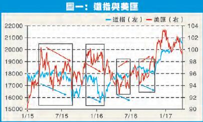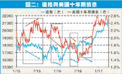 美股與美匯走勢似乎反轉,而債市亦未必一定跟美股方向走。圖二見到,2015年中當美股調整時,美國十年期債息仍然炒上。另外,2016下半年股市調整間,美債息反而大幅炒上。筆者一向比較小心處理債市情況,因為與股匯市不同,近年債市投資者一向較不相信聯儲局會收水加息,直到去年聯儲局的加息態度漸轉強硬后才有所轉變。不單是美債,環球債市於去年下半年才開始見到明顯調整,反映市場終於相信美國收水加息。如是者,對比美股及美匯、美債走勢需要較獨立的分析。