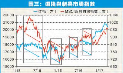 最后,美股跌,大家定會認為資金將轉炒新興市場。看看圖三,這兩年多來美股調整間,每次都見到新興市場股市會一同下跌,無論是2015年間的美股大跌,抑或是2016年中前后的兩次中小型調整,新興股市都無一幸免。故此,美股跌市會令資金轉炒新興股市?未必。