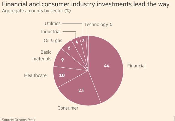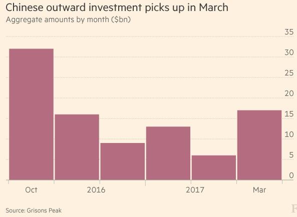 倫敦投資銀行Grisons Peak發現,中國企業對海外同行的投資(從購買少數股權到完全收購)從2月的60億美元升至3月的170億美元。