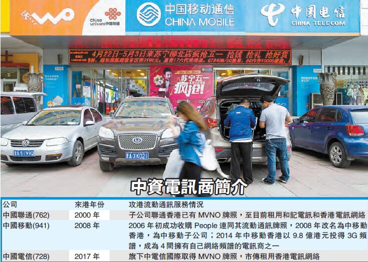 雖然中電信落地香港,但仍沒有自己尅的流動通訊牌照,要租借別家的網絡。相反,在香港落地生根的中移動早於10年前已在移動通訊市場割據一方。根據通訊事務管理局資料,目前香港共有4家流動網絡服務營辦商:中國移動香港、香港電訊(6823)、和記電訊香港(215),以及數碼通(315)。